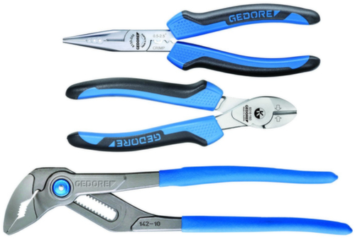 "longDescription": "Praktische set samenstelling, In GEDORE L-BOXX® Mini, incl. Assortiment verdelers, Afmetingen: B 260 x D 155 x H 63 mm, Inclusief assortiment vakverdelers, Voor het opbergen van kleine onderdelen, Universele tang 142 7 TL, Fijninstelling via drukknop, 15-standen instelling, Smalle tangkop voor moeilijk bereikbare plaatsen, Verstelbare grijpvlakken, Zelfklemmend op moeren en buizen, Inductiegeharde tanden, staalgrijs, met blauw gedompelde antislip handgrepen, Krachtige zijsnijtang 8316-160 JC, Hoge hefboomwerking voor gemakkelijk snijden, Inductiegeharde precisiesnijvlakken, Hardheid van de snijkanten 63 - 65 HRC, Voor harde draad/pianodraad tot max. ∅ 2,0 mm, GEDORE speciaal gehard en getemperd staal, gesmeed, in olie gehard en getemperd, verchroomd, met 2-componenten grijphulzen, Multifunctionele tang 8133-200 JC , Multifunctionele tang voor mechanische en elektronische toepassingen, Vastpakken, knippen, strippen, Krimpen, krimpen, Platronde bekken, Rechte, gekartelde grijpvlakken, Inductiegeharde precisiesnijkanten, Snijkanthardheid 62 - 64 HRC, Voor middelharde draad 1,6 mm, GEDORE speciaal gehard en getemperd staal, Gesmeed, in olie gehard en getemperd<br>",
