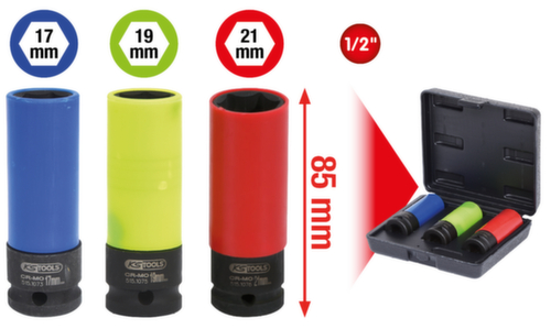 "longDescription": "Robuuste uitvoering, speciaal voor de montage of demontage van wielen, zeskantige, vierkante inbus volgens DIN 3121 / ISO 1174, lange uitvoering, voor machinaal gebruik, met kunststof bekleed voor schadevrij werken aan aluminium velgen, met kunststof inzetstuk ter bescherming van de oppervlakken van de wielbouten, kunststof huls verwisselbaar, kleurcodering naar sleutelmaat, gefosfateerd, chroom-molybdeen, in robuuste kunststof koffer<br>",