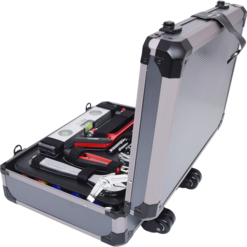 "longDescription": "Zeskantig, flanktractieprofiel, mat gesatineerd, chroom vanadium, greep met telescopische uittrekfunctie, in elegante aluminium trolley<br>",