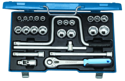 "longDescription": "Met gesmede, geharde, handbediende zeskant UD profiel (nr. 19) of 12-punts UD profiel (nr. D 19) doppen, Met bedieningsgereedschap van vanadium staal 31CrV3, Met robuuste hefboomratel, met drukknopontgrendeling, In GEDORE blauw plaatstalen koffer, Afmetingen: 425 x 277 x 55 mm<br>",