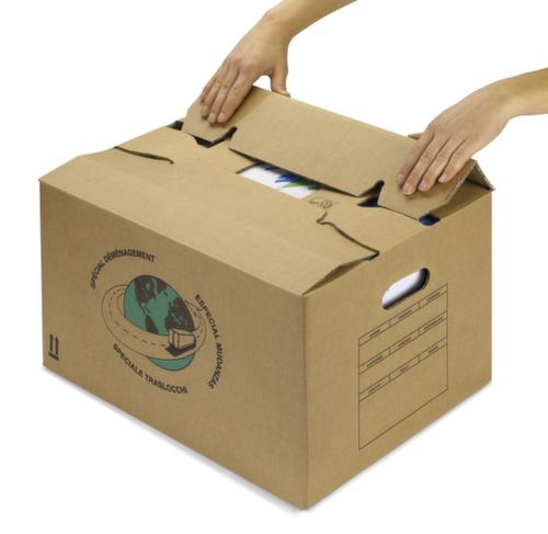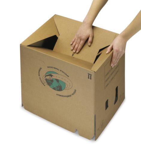 De belangrijkste details in één oogopslag:Voor pakketten tot 30 kg. De doos is snel in elkaar te zetten dankzij de halfautomatische bodem. afsluitbaar met gekruiste kleppen. draaggrepen. Met schrijfvlak aan de zijden.