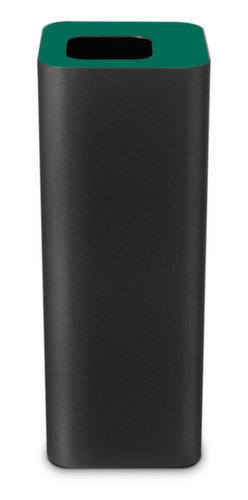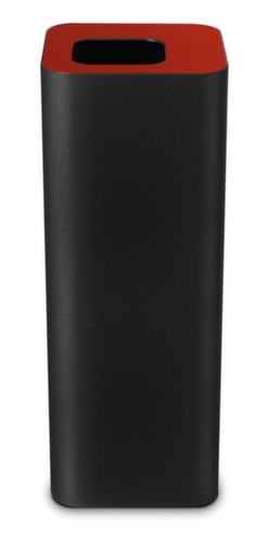 de belangrijkste maten van de afvalbak PURE ESSENTIAL in één oogopslag:klemring voor de zakbevestiging. romp van staal met slag- en krasvaste poedercoating in zwart.