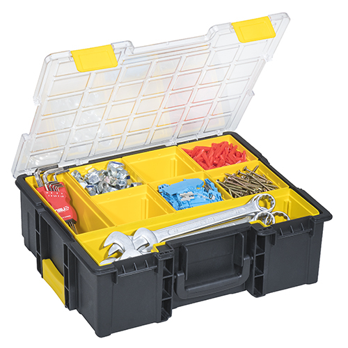 uitgerust met Inzetboxen. bakken uitneembaar. met draaggreep. koffer van breukvast polypropyleen. koffer in zwart. bakken in geel. Afsluitbaar met deksel, met Sluitclips. deksel van polycarbonaat.