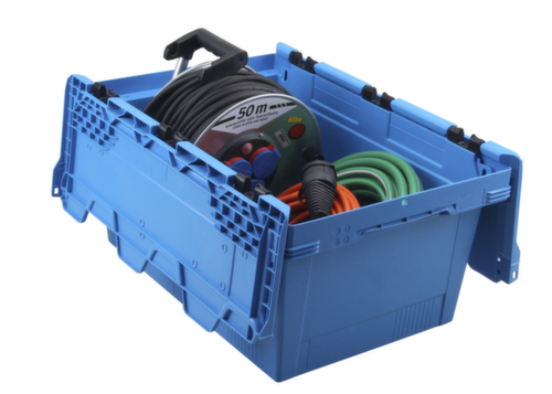 maten afgestemd op europallet. van breukvast polypropyleen in blauw. Wanden gesloten, bodem gesloten. krokodildeksel. Met gesloten deksel stapelbaar. Met open deksel in elkaar stapelbaar. geschikt voor levensmiddelen. Temperatuurbestendig -10 °C tot +60 °C.