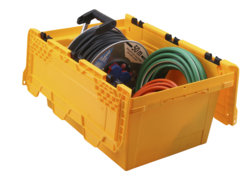 maten afgestemd op europallet. van breukvast polypropyleen in geel. Wanden gesloten, bodem gesloten. krokodildeksel. Met gesloten deksel stapelbaar. Met open deksel in elkaar stapelbaar. geschikt voor levensmiddelen. Temperatuurbestendig -10 °C tot +60 °C.