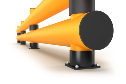 de belangrijkste maten van het a.m.p.e.r.e. aanrijdbeveiligingssysteem Rack Mammut® in één oogopslag:De barrière absorbeert botsenergie dankzij de speciale kunststof en neemt zijn oorspronkelijke vorm weer aan. van hoogwaardige en duurzame polyolefine in geel/zwart. fixering via bodemplaat met grondankers.