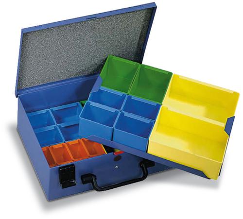 Afsluitbaar via veiligheidsslot. bakken uitneembaar en beschrijfbaar. met draaggreep. koffers van staal / bakken van slagvast polystyreen. koffer met met slag- en krasvaste poedercoating in RAL5007 briljantblauw. bakken in gekleurd. Afsluitbaar met deksel, met schuimstof-drukvulling.