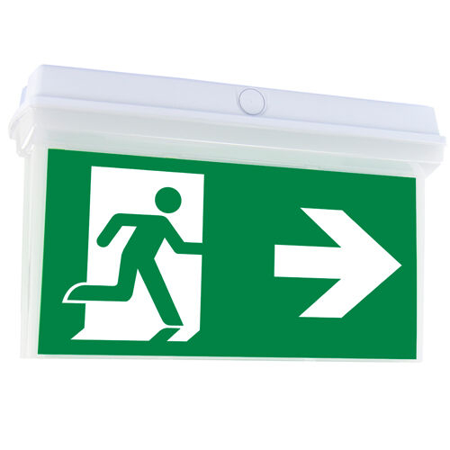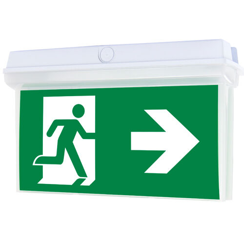 symbool/tekst: "Nooduitgang/vluchtweg links/vluchtweg rechts". Richtingwijzer via pijl rechts/links. Lamp voor plafondmontage, insteekbare aanwijzingsborden van pvc-folie.