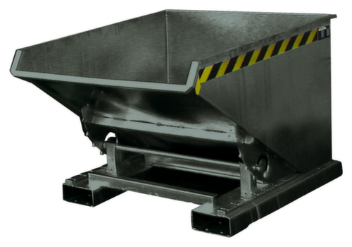 Handig kiepen vanaf de bestuurdersstoel dankzij trekkoordontgrendeling. Kantelen verloopt rustig omdat de sleden gebruik maken van een gunstig lastzwaartepunt. Na het legen zwenkt de kiepbak automatisch terug naar de uitgangspositie en de kantelbeveiliging klikt weer automatisch vast. Met een beveiligingsketting aan de vorksloffen van de heftruck kan de kiepbak extra worden beveiligd tegen wegglijden . Zeer stabiel door omgeslagen randversteviging rondom en stevig basisframe. Robuuste constructie van staal gelakt in RAL7005 muisgrijs. Om de kiepbak gemakkelijk te transporteren en te legen, tilt u hem eenvoudig met een heftruck op via de vorksloffen en rijdt u hem naar de gewenste plek en de vereiste hoogte.