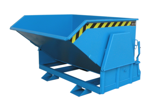 Handig kiepen vanaf de bestuurdersstoel dankzij trekkoordontgrendeling. Door de speciale plaats van het draaipunt is snel en volledig legen mogelijk. De bak kantelt rustig zonder schokbelasting omdat het heftruckvriendelijke afrolmechanisme gebruik maakt van een gunstig lastzwaartepunt. Voor veilig gebruik is het speciale mechanisme afgedekt. Na het legen zwenkt de kiepbak automatisch terug naar de uitgangspositie en de kantelbeveiliging klikt weer automatisch vast. Met een beveiligingsketting aan de vorksloffen van de heftruck kan de kiepbak extra worden beveiligd tegen wegglijden . Robuuste constructie van staal gelakt in RAL 5012 lichtblauw. Om de kiepbak gemakkelijk te transporteren en te legen, tilt u hem eenvoudig met een heftruck op via de vorksloffen en rijdt u hem naar de gewenste plek en de vereiste hoogte.