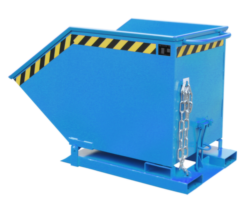 De belangrijkste maten van de Bauer kiepbak in één oogopslagHet kiepen gaat gemakkelijk handmatig via een hendel aan de achterzijde. Ter bescherming tegen onbedoeld kantelen grijpt de anti-kantelbeveiliging met veer automatisch in wanneer de bak wordt teruggezet. De kiepbak is ook geschikt voor de opname van vloeistoffen - olie en waterdicht gelast. Hoge stabiliteit door omgeslagen randversteviging rondom. Robuuste constructie van staal gelakt in RAL 5012 lichtblauw. Om de kiepbak gemakkelijk te transporteren en te legen, tilt u hem eenvoudig met een heftruck op via de vorksloffen en rijdt u hem naar de gewenste plek en de vereiste hoogte.