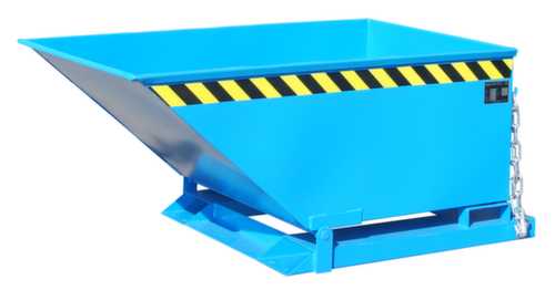 De belangrijkste maten van de Bauer kiepbak in één oogopslagHet kiepen gaat gemakkelijk handmatig via een hendel aan de achterzijde. Ter bescherming tegen onbedoeld kantelen grijpt de anti-kantelbeveiliging met veer automatisch in wanneer de bak wordt teruggezet. De kiepbak is ook geschikt voor de opname van vloeistoffen - olie en waterdicht gelast. Hoge stabiliteit door omgeslagen randversteviging rondom. Robuuste constructie van staal gelakt in RAL 5012 lichtblauw. Om de kiepbak gemakkelijk te transporteren en te legen, tilt u hem eenvoudig met een heftruck op via de vorksloffen en rijdt u hem naar de gewenste plek en de vereiste hoogte.