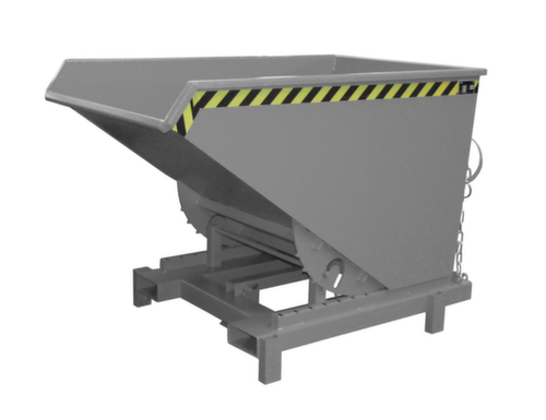 Als de kiepbak op de containerrand wordt geplaatst, geeft de ontgrendelvoet de ontgrendeling vrij en wordt de bak automatisch geleegd. Dit versnelt het arbeidsproces en verhoogt de veiligheid in uw bedrijf. De bak kan ook altijd handmatig worden geleegd via trekkoordontgrendeling. Kantelen verloopt rustig omdat de sleden gebruik maken van een gunstig lastzwaartepunt. Na het legen zwenkt de kiepbak automatisch terug naar de uitgangspositie en de kantelbeveiliging klikt weer automatisch vast. Robuuste constructie van staal gelakt in RAL7005 muisgrijs. Om de kiepbak gemakkelijk te transporteren en te legen, tilt u hem eenvoudig met een heftruck op via de vorksloffen en rijdt u hem naar de gewenste plek en de vereiste hoogte.