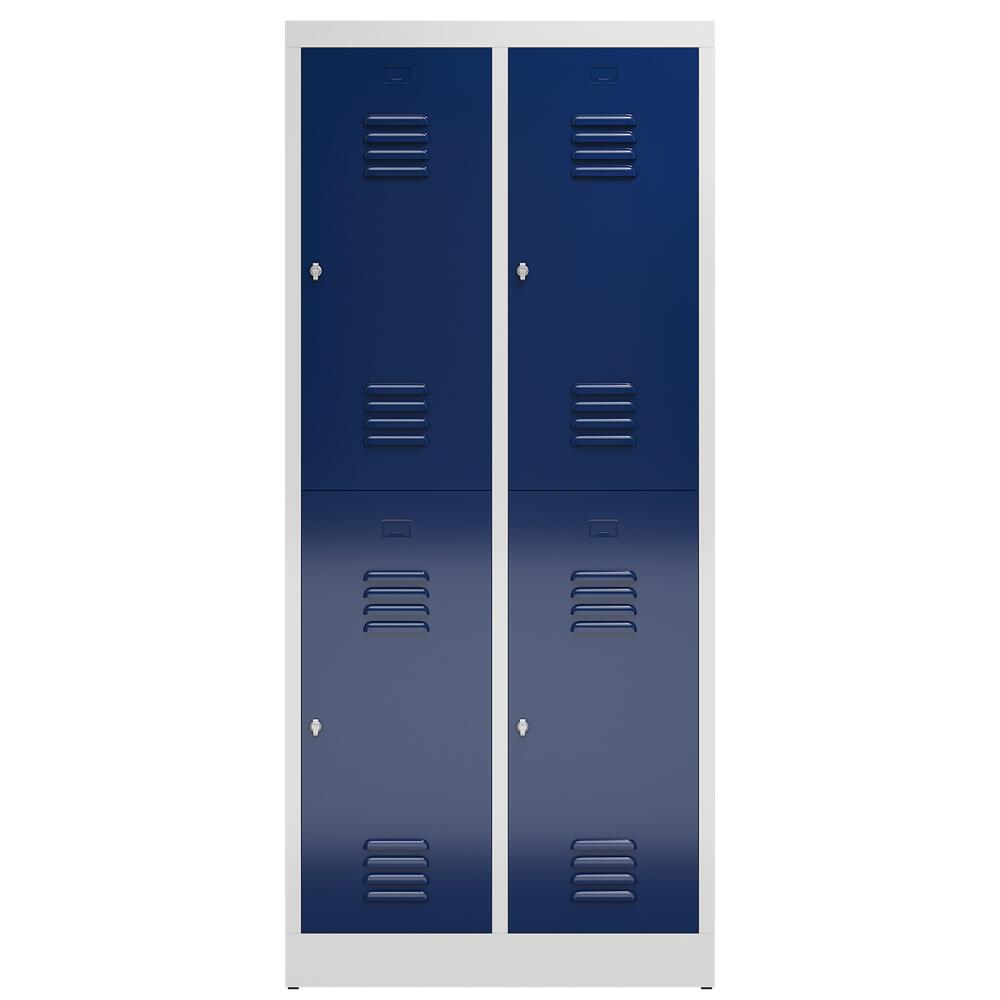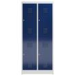 per vak 1 kledingstang en 2 dubbele haken per vak. openslaande deur met ventilatiesleuven. afsluitbaar met klinksluiting voor hangslot. elk vak apart afsluitbaar. De sokkel onder de kast zorgt ervoor dat het gewicht van de kast gelijkmatig over de vloer wordt verdeeld. Hierdoor staat de kast stabieler en kan hij zwaardere lasten dragen dan een kast met voeten. En omdat er geen vuil, stof en vocht onder kan komen, hoeft er onder de kast niet te worden schoongemaakt. constructie van staal, gelast. romp met elektrostatische poedercoating in RAL7035 lichtgrijs, front met elektrostatische poedercoating in RAL5010 gentiaanblauw.