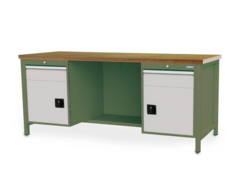 4-voetonderstel. Uitrusting: 2 laden, 2 kasten, 1/2 legbord. Links 1 lade, 1 kast. midden 1/2 legbord. Rechts 1 lade, 1 kast. laden hoogte 2x150 mm. nuttige afmetingen lade breedte x diepte 600 x 600 mm. draagvermogen per lade 100 kg. laden met kogelgelagerde wielgeleiding, uittrekbaar legbord 100 %. laden met sleuven voor opname van indelingsmateriaal. met De enkele uittrekstop voorkomt dat meerdere laden tegelijk worden geopend en voorkomt omvallen. greeplijst. beletteringsstrook. afsluitbaar met cilinderslot. constructie van staal.