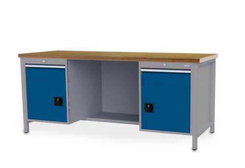 4-voetonderstel. Uitrusting: 2 laden, 2 kasten, 1/2 legbord. Links 1 lade, 1 kast. midden 1/2 legbord. Rechts 1 lade, 1 kast. laden hoogte 2x150 mm. nuttige afmetingen lade breedte x diepte 600 x 600 mm. draagvermogen per lade 100 kg. laden met kogelgelagerde wielgeleiding, uittrekbaar legbord 100 %. laden met sleuven voor opname van indelingsmateriaal. met De enkele uittrekstop voorkomt dat meerdere laden tegelijk worden geopend en voorkomt omvallen. greeplijst. beletteringsstrook. afsluitbaar met cilinderslot. constructie van staal.