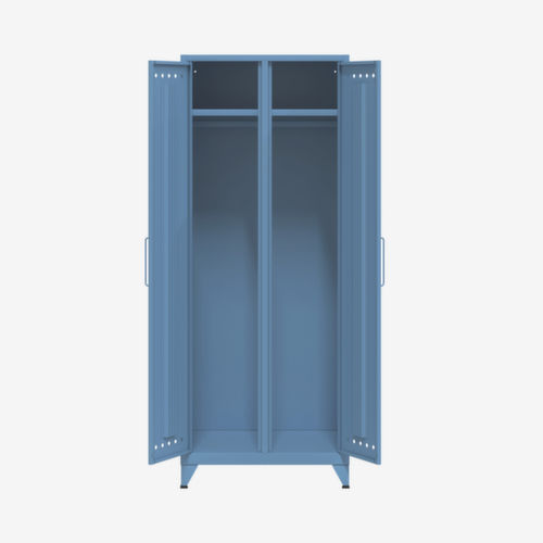De belangrijkste afmetingen van de Bisley wasgoedkast Fern Maxi in één oogopslag:per vak hoedenplank en kledingstang. met scheidingswand. Stofdicht afsluitbaar d.m.v. dubbele openslaande deur. deur sluit goed op de romp aan. Met grepen. Via de design-ventilatiegaten in de deur wordt lucht voortdurend gecirculeerd. staat stevig door 4 voeten. constructie van staal, gelast. romp gelakt in blauw, front gelakt in blauw.