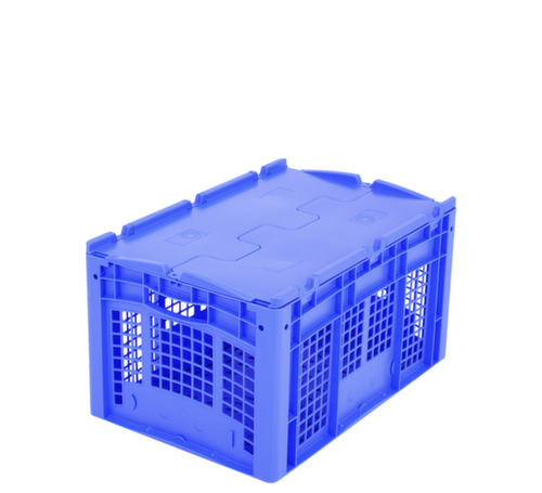 maten afgestemd op europallet. van breukvast polypropyleen in blauw. Wanden doorbroken, bodem doorbroken. Bodem met versteviging door dubbele verstevigingsribben. De opgeslagen goederen zijn beschermd tegen stof en vuil door de tweedelige scharnierdeksel. eenvoudig transport door open greep. Meervoudig stapelbaar. geschikt voor levensmiddelen.