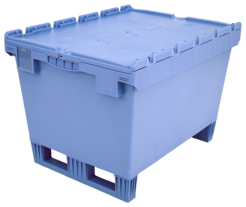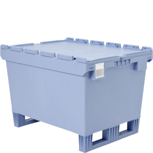 In euromaat. van breukvast polypropyleen in duifblauw. De opgeslagen goederen zijn door de gesloten wanden beschermd tegen stof en de bak is gemakkelijk te reinigen. legbord gesloten met versteviging door verstevigingsribben. krokodildeksel. Dankzij de sleden gemakkelijk te verplaatsen en in te rijden met een heftruck. Plaatsbesparend stapelbaar. Geschikt voor rollenbanen.