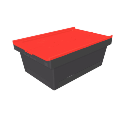 van polypropyleen regeneraat. De opgeslagen goederen zijn door de gesloten wanden beschermd tegen stof en de bak is gemakkelijk te reinigen. legbord gesloten. tweedelig klapdeksel in rood. deksel van Nieuw granulaat. Meervoudig stapelbaar. Met open deksel in elkaar stapelbaar.
