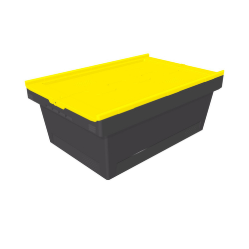 van polypropyleen regeneraat. De opgeslagen goederen zijn door de gesloten wanden beschermd tegen stof en de bak is gemakkelijk te reinigen. legbord gesloten. tweedelig klapdeksel in geel. deksel van Nieuw granulaat. Meervoudig stapelbaar. Met open deksel in elkaar stapelbaar.