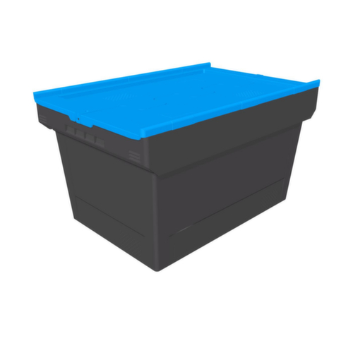 van polypropyleen regeneraat. De opgeslagen goederen zijn door de gesloten wanden beschermd tegen stof en de bak is gemakkelijk te reinigen. legbord gesloten. tweedelig klapdeksel in blauw. deksel van Nieuw granulaat. Meervoudig stapelbaar. Met open deksel in elkaar stapelbaar.