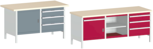 "title": "bott Werkbank met opbergruimte cubio, 6 laden, 1 legbord, RAL7035 lichtgrijs/RAL3004 purperrood",