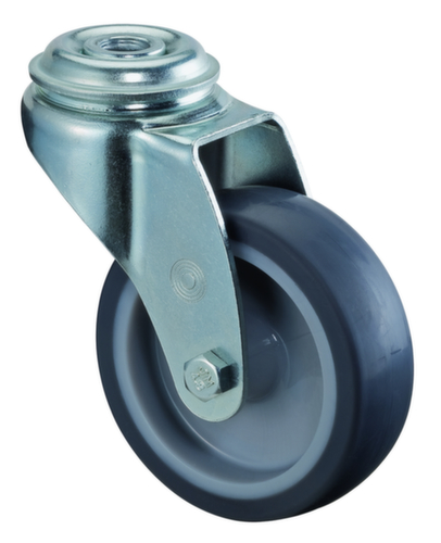 naaf met schok- en corrosiebestendig glijlager. velg van kunststof. velg zonder draadvangkappen. behuizing van staal verzinkt, gechromeerd. bevestiging met ruggat, Ø 10,2 mm. Zwenklager met Kogelbaan, twee rijen.