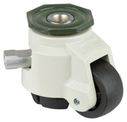 met slijtvaste, geluidsarme polyamide-banden. wiel Ø 50 mm. naaf met schok- en corrosiebestendig glijlager. Met geïntegreerde stelvoet met ratelverstelling voor het vastzetten. behuizing van gegoten aluminium. bevestiging met ruggat.