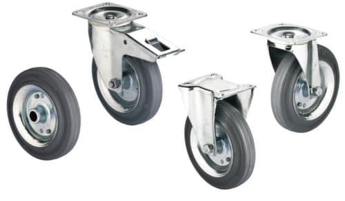 "longDescription": "<h2>Niet-markerende wielen van massief rubber</h2><strong>zacht voor gladde en ruwe vloeren</strong><br><ul><li>Duurzaam en roestvrij - velg, stuurhuis en schraagvorken van gegalvaniseerd plaatstaal</li><li>Lekvrij - massief rubberen banden</li><li>Bestendig en robuust - naaf met rollagers</li><li>Kogelring met dubbele rij in de vorkkop</li></ul><br><h3>Je hebt de keuze:</h3><ul><li>Voor elke toepassing het juiste - als zwenkwiel met of zonder rem, als bokwiel of reservewiel</li></ul>",