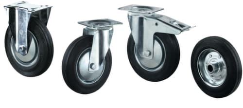 "description": "in verschillende uitvoeringen en wieldiameters, met of zonder rem, met stalen velg en rollager",
