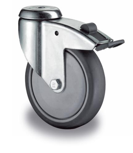 naaf met voor continu gebruik geschikte kogellager. Dubbele rem om stuurmechanisme en wiel tegelijkertijd te blokkeren. velg van kunststof. velg met draadvangkap die voorkomt dat de draad in de war komt ervoor zorgt dat het wiel rol minder vaak onderhoud nodig heeft. behuizing van staal met corrosiebeschermende zinklaag. bevestiging met ruggat, Ø 12,2 mm. Zwenklager met kogellager.
