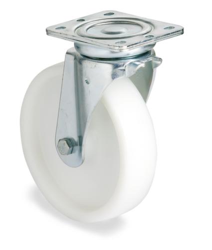 "description": "draagvermogen tot 600 kg, kunststof, in verschillende uitvoeringen en wieldiameters, met kunststof velg en rollager",