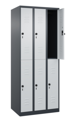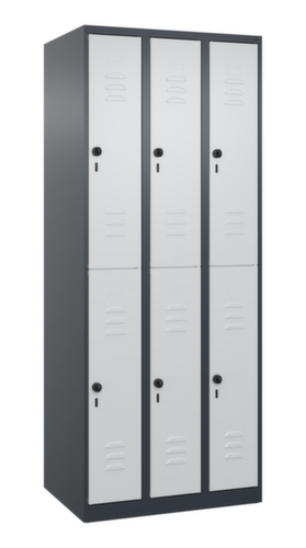 de belangrijkste maten van de C+P garderobekast Classic Plus in één oogopslag:per vak 2 kastvakken, elk met een kledingstang en 3 niet verdraaibare dubbele schuifhaken. openslaande deur met etikettenlijst en ventilatiesleuven. Door de binnenliggende penscharnieren zien de inliggende deuren er strak uit, want aan de buitenkant zijn geen schroeven of scharnieren zichtbaar. Dus de scharnieren doen geen afbreuk aan het design waardoor de hele kast er hoogwaardiger uitziet. Bovendien is het gladde oppervlak gemakkelijker te reinigen, zonder moeilijk bereikbare plaatsen waar vuil of stof zich kan ophopen. Elke deur is standaard uitgerust met een systeem voor gedempte sluiting , zodat de deur niet dichtslaat, zelfs niet wanneer deze een krachtige duw krijgt. Dit draagt niet alleen bij aan een rustigere werkomgeving, maar beschermt de stalen kast ook tegen beschadiging. Geïnspireerd door de natuur levert het BIONIC Steel Frame een bijzonder efficiënte en stabiele constructie op. De torsiestijfheid neemt verder toe door een ingenieuze structuur aan de binnenkant met plooien, steunen en tussenruimten, en door materiaalversterking op belangrijke punten, zoals aan de voorkant van de zijwanden en in de scheidingswand en kokerprofielen. Afsluitbaar met Veiligheidsdraaigrendel voor hangslot. Het veiligheidsslot is uitermate goed bestand tegen inbraak, omdat het doordraait wanneer het is vergrendeld en pas grijpt wanneer het slot is verwijderd. Passend voor alle hangsloten met een beugeldikte van 6 - 8 mm. De extra ventilatieopeningen in het vak, in combinatie met de ventilatiesleuven in de deur, verbeteren de luchtstroom. Dit zorgt voor een goede ventilatie in de kast waardoor de inhoud sneller droogt zonder onaangename geurtjes. De kast staat direct op de vloer, zonder sokkel of poten, voor een compacte en ruimtebesparende look. Alleen stelschroeven zorgen voor een stabiele stand als de vloer eventueel ongelijk is. De bodem van de kast is tevens verzinkt voor een betere bescherming tegen corrosie. constructie van staal, stevig gelast. Dit maakt de constructie zeer robuust en sterk en dus duurzamer. Omdat de hoeken en randen van de romp gelast zijn, is de kast goed afgedicht en dus beter beschermd tegen stof, vocht en vuil dan bij een schroefconstructie. Bovendien is regelmatig onderhoud en nastellen niet nodig. romp met moffellak in RAL7016 antracietgrijs, front met moffellak in RAL7035 lichtgrijs.
