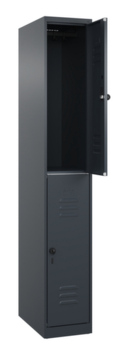de belangrijkste maten van de C+P garderobekast Classic Plus in één oogopslag:per vak 2 kastvakken, elk met een kledingstang en 3 niet verdraaibare dubbele schuifhaken. openslaande deur met etikettenlijst en ventilatiesleuven. Door de binnenliggende penscharnieren zien de inliggende deuren er strak uit, want aan de buitenkant zijn geen schroeven of scharnieren zichtbaar. Dus de scharnieren doen geen afbreuk aan het design waardoor de hele kast er hoogwaardiger uitziet. Bovendien is het gladde oppervlak gemakkelijker te reinigen, zonder moeilijk bereikbare plaatsen waar vuil of stof zich kan ophopen. Elke deur is standaard uitgerust met een systeem voor gedempte sluiting , zodat de deur niet dichtslaat, zelfs niet wanneer deze een krachtige duw krijgt. Dit draagt niet alleen bij aan een rustigere werkomgeving, maar beschermt de stalen kast ook tegen beschadiging. Geïnspireerd door de natuur levert het BIONIC Steel Frame een bijzonder efficiënte en stabiele constructie op. De torsiestijfheid neemt verder toe door een ingenieuze structuur aan de binnenkant met plooien, steunen en tussenruimten, en door materiaalversterking op belangrijke punten, zoals aan de voorkant van de zijwanden en in de scheidingswand en kokerprofielen. Afsluitbaar met Veiligheidsdraaigrendel voor hangslot. Het veiligheidsslot is uitermate goed bestand tegen inbraak, omdat het doordraait wanneer het is vergrendeld en pas grijpt wanneer het slot is verwijderd. Passend voor alle hangsloten met een beugeldikte van 6 - 8 mm. De extra ventilatieopeningen in het vak, in combinatie met de ventilatiesleuven in de deur, verbeteren de luchtstroom. Dit zorgt voor een goede ventilatie in de kast waardoor de inhoud sneller droogt zonder onaangename geurtjes. De kast staat direct op de vloer, zonder sokkel of poten, voor een compacte en ruimtebesparende look. Alleen stelschroeven zorgen voor een stabiele stand als de vloer eventueel ongelijk is. De bodem van de kast is tevens verzinkt voor een betere bescherming tegen corrosie. constructie van staal, stevig gelast. Dit maakt de constructie zeer robuust en sterk en dus duurzamer. Omdat de hoeken en randen van de romp gelast zijn, is de kast goed afgedicht en dus beter beschermd tegen stof, vocht en vuil dan bij een schroefconstructie. Bovendien is regelmatig onderhoud en nastellen niet nodig. romp met moffellak in RAL7016 antracietgrijs, front met moffellak in RAL7016 antracietgrijs.