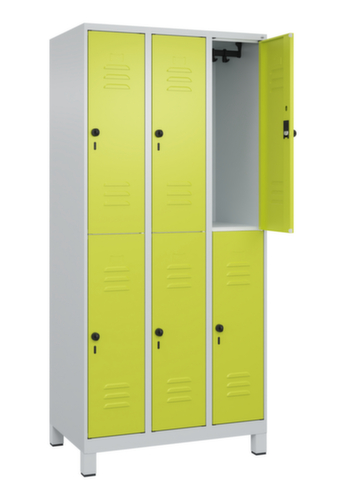 de belangrijkste maten van de C+P garderobekast Classic Plus in één oogopslag:per vak 2 kastvakken, elk met een kledingstang en 3 niet verdraaibare dubbele schuifhaken. openslaande deur met etikettenlijst en ventilatiesleuven. Door de binnenliggende penscharnieren zien de inliggende deuren er strak uit, want aan de buitenkant zijn geen schroeven of scharnieren zichtbaar. Dus de scharnieren doen geen afbreuk aan het design waardoor de hele kast er hoogwaardiger uitziet. Bovendien is het gladde oppervlak gemakkelijker te reinigen, zonder moeilijk bereikbare plaatsen waar vuil of stof zich kan ophopen. Elke deur is standaard uitgerust met een systeem voor gedempte sluiting , zodat de deur niet dichtslaat, zelfs niet wanneer deze een krachtige duw krijgt. Dit draagt niet alleen bij aan een rustigere werkomgeving, maar beschermt de stalen kast ook tegen beschadiging. Geïnspireerd door de natuur levert het BIONIC Steel Frame een bijzonder efficiënte en stabiele constructie op. De torsiestijfheid neemt verder toe door een ingenieuze structuur aan de binnenkant met plooien, steunen en tussenruimten, en door materiaalversterking op belangrijke punten, zoals aan de voorkant van de zijwanden en in de scheidingswand en kokerprofielen. Afsluitbaar met Veiligheidsdraaigrendel voor hangslot. Het veiligheidsslot is uitermate goed bestand tegen inbraak, omdat het doordraait wanneer het is vergrendeld en pas grijpt wanneer het slot is verwijderd. Passend voor alle hangsloten met een beugeldikte van 6 - 8 mm. De extra ventilatieopeningen in het vak, in combinatie met de ventilatiesleuven in de deur, verbeteren de luchtstroom. Dit zorgt voor een goede ventilatie in de kast waardoor de inhoud sneller droogt zonder onaangename geurtjes. Door de kunststof voeten onder de kast ziet de kast er niet alleen modern en minder massief uit, maar de voeten bieden ook praktische voordelen. De ruimte onder de kast is gemakkelijker schoon te maken en het kunststof van de voeten biedt een betere bescherming tegen corrosie. Vooral in omgevingen waar hogere eisen aan de hygiëne worden gesteld, is dit een belangrijk aspect. constructie van staal, stevig gelast. Dit maakt de constructie zeer robuust en sterk en dus duurzamer. Omdat de hoeken en randen van de romp gelast zijn, is de kast goed afgedicht en dus beter beschermd tegen stof, vocht en vuil dan bij een schroefconstructie. Bovendien is regelmatig onderhoud en nastellen niet nodig. romp met moffellak in RAL7035 lichtgrijs, front met moffellak in RDS 110 80 60 viridinegroen.