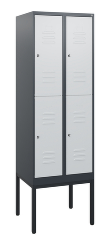 de belangrijkste maten van de C+P garderobekast Classic Plus in één oogopslag:per vak 2 kastvakken, elk met een kledingstang en 3 niet verdraaibare dubbele schuifhaken. openslaande deur met etikettenlijst en ventilatiesleuven. Door de binnenliggende penscharnieren zien de inliggende deuren er strak uit, want aan de buitenkant zijn geen schroeven of scharnieren zichtbaar. Dus de scharnieren doen geen afbreuk aan het design waardoor de hele kast er hoogwaardiger uitziet. Bovendien is het gladde oppervlak gemakkelijker te reinigen, zonder moeilijk bereikbare plaatsen waar vuil of stof zich kan ophopen. Elke deur is standaard uitgerust met een systeem voor gedempte sluiting , zodat de deur niet dichtslaat, zelfs niet wanneer deze een krachtige duw krijgt. Dit draagt niet alleen bij aan een rustigere werkomgeving, maar beschermt de stalen kast ook tegen beschadiging. Geïnspireerd door de natuur levert het BIONIC Steel Frame een bijzonder efficiënte en stabiele constructie op. De torsiestijfheid neemt verder toe door een ingenieuze structuur aan de binnenkant met plooien, steunen en tussenruimten, en door materiaalversterking op belangrijke punten, zoals aan de voorkant van de zijwanden en in de scheidingswand en kokerprofielen. afsluitbaar met cilinderslot. De extra ventilatieopeningen in het vak, in combinatie met de ventilatiesleuven in de deur, verbeteren de luchtstroom. Dit zorgt voor een goede ventilatie in de kast waardoor de inhoud sneller droogt zonder onaangename geurtjes. Het ondergebouwde voetonderstel vermindert mogelijke ophoping van vuil en stof, omdat het gemakkelijker is om alle oppervlakken volledig te reinigen. Bovendien ontstaat hierdoor extra opbergruimte onder de kast. Schoenen en tassen staan niet meer in de weg, het risico op struikelen wordt kleiner. constructie van staal, stevig gelast. Dit maakt de constructie zeer robuust en sterk en dus duurzamer. Omdat de hoeken en randen van de romp gelast zijn, is de kast goed afgedicht en dus beter beschermd tegen stof, vocht en vuil dan bij een schroefconstructie. Bovendien is regelmatig onderhoud en nastellen niet nodig. romp met moffellak in RAL7016 antracietgrijs, front met moffellak in RAL7035 lichtgrijs.