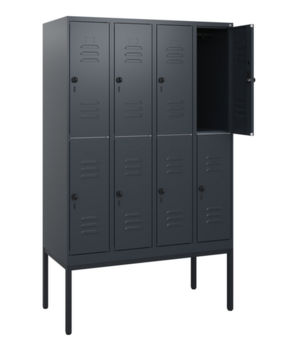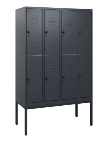 de belangrijkste maten van de C+P garderobekast Classic Plus in één oogopslag:per vak 2 kastvakken, elk met een kledingstang en 3 niet verdraaibare dubbele schuifhaken. openslaande deur met etikettenlijst en ventilatiesleuven. Door de binnenliggende penscharnieren zien de inliggende deuren er strak uit, want aan de buitenkant zijn geen schroeven of scharnieren zichtbaar. Dus de scharnieren doen geen afbreuk aan het design waardoor de hele kast er hoogwaardiger uitziet. Bovendien is het gladde oppervlak gemakkelijker te reinigen, zonder moeilijk bereikbare plaatsen waar vuil of stof zich kan ophopen. Elke deur is standaard uitgerust met een systeem voor gedempte sluiting , zodat de deur niet dichtslaat, zelfs niet wanneer deze een krachtige duw krijgt. Dit draagt niet alleen bij aan een rustigere werkomgeving, maar beschermt de stalen kast ook tegen beschadiging. Geïnspireerd door de natuur levert het BIONIC Steel Frame een bijzonder efficiënte en stabiele constructie op. De torsiestijfheid neemt verder toe door een ingenieuze structuur aan de binnenkant met plooien, steunen en tussenruimten, en door materiaalversterking op belangrijke punten, zoals aan de voorkant van de zijwanden en in de scheidingswand en kokerprofielen. Afsluitbaar met Veiligheidsdraaigrendel voor hangslot. Het veiligheidsslot is uitermate goed bestand tegen inbraak, omdat het doordraait wanneer het is vergrendeld en pas grijpt wanneer het slot is verwijderd. Passend voor alle hangsloten met een beugeldikte van 6 - 8 mm. De extra ventilatieopeningen in het vak, in combinatie met de ventilatiesleuven in de deur, verbeteren de luchtstroom. Dit zorgt voor een goede ventilatie in de kast waardoor de inhoud sneller droogt zonder onaangename geurtjes. Het ondergebouwde voetonderstel vermindert mogelijke ophoping van vuil en stof, omdat het gemakkelijker is om alle oppervlakken volledig te reinigen. Bovendien ontstaat hierdoor extra opbergruimte onder de kast. Schoenen en tassen staan niet meer in de weg, het risico op struikelen wordt kleiner. constructie van staal, stevig gelast. Dit maakt de constructie zeer robuust en sterk en dus duurzamer. Omdat de hoeken en randen van de romp gelast zijn, is de kast goed afgedicht en dus beter beschermd tegen stof, vocht en vuil dan bij een schroefconstructie. Bovendien is regelmatig onderhoud en nastellen niet nodig. romp met moffellak in RAL7016 antracietgrijs, front met moffellak in RAL7016 antracietgrijs.