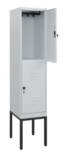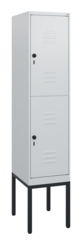 de belangrijkste maten van de C+P garderobekast Classic Plus in één oogopslag:per vak 2 kastvakken, elk met een kledingstang en 3 niet verdraaibare dubbele schuifhaken. openslaande deur met etikettenlijst en ventilatiesleuven. Door de binnenliggende penscharnieren zien de inliggende deuren er strak uit, want aan de buitenkant zijn geen schroeven of scharnieren zichtbaar. Dus de scharnieren doen geen afbreuk aan het design waardoor de hele kast er hoogwaardiger uitziet. Bovendien is het gladde oppervlak gemakkelijker te reinigen, zonder moeilijk bereikbare plaatsen waar vuil of stof zich kan ophopen. Elke deur is standaard uitgerust met een systeem voor gedempte sluiting , zodat de deur niet dichtslaat, zelfs niet wanneer deze een krachtige duw krijgt. Dit draagt niet alleen bij aan een rustigere werkomgeving, maar beschermt de stalen kast ook tegen beschadiging. Geïnspireerd door de natuur levert het BIONIC Steel Frame een bijzonder efficiënte en stabiele constructie op. De torsiestijfheid neemt verder toe door een ingenieuze structuur aan de binnenkant met plooien, steunen en tussenruimten, en door materiaalversterking op belangrijke punten, zoals aan de voorkant van de zijwanden en in de scheidingswand en kokerprofielen. Afsluitbaar met Veiligheidsdraaigrendel voor hangslot. Het veiligheidsslot is uitermate goed bestand tegen inbraak, omdat het doordraait wanneer het is vergrendeld en pas grijpt wanneer het slot is verwijderd. Passend voor alle hangsloten met een beugeldikte van 6 - 8 mm. De extra ventilatieopeningen in het vak, in combinatie met de ventilatiesleuven in de deur, verbeteren de luchtstroom. Dit zorgt voor een goede ventilatie in de kast waardoor de inhoud sneller droogt zonder onaangename geurtjes. Het ondergebouwde voetonderstel vermindert mogelijke ophoping van vuil en stof, omdat het gemakkelijker is om alle oppervlakken volledig te reinigen. Bovendien ontstaat hierdoor extra opbergruimte onder de kast. Schoenen en tassen staan niet meer in de weg, het risico op struikelen wordt kleiner. constructie van staal, stevig gelast. Dit maakt de constructie zeer robuust en sterk en dus duurzamer. Omdat de hoeken en randen van de romp gelast zijn, is de kast goed afgedicht en dus beter beschermd tegen stof, vocht en vuil dan bij een schroefconstructie. Bovendien is regelmatig onderhoud en nastellen niet nodig. romp met moffellak in RAL7035 lichtgrijs, front met moffellak in RAL7035 lichtgrijs.