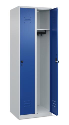de belangrijkste maten van de C+P garderobekast Classic Plus in één oogopslag:per vak een vastgelaste hoedenplank en een kledingstang eronder met 3 niet verdraaibare, dubbele schuifhaken. openslaande deur met etikettenlijst en ventilatiesleuven. Door de binnenliggende penscharnieren zien de inliggende deuren er strak uit, want aan de buitenkant zijn geen schroeven of scharnieren zichtbaar. Dus de scharnieren doen geen afbreuk aan het design waardoor de hele kast er hoogwaardiger uitziet. Bovendien is het gladde oppervlak gemakkelijker te reinigen, zonder moeilijk bereikbare plaatsen waar vuil of stof zich kan ophopen. Elke deur is standaard uitgerust met een systeem voor gedempte sluiting , zodat de deur niet dichtslaat, zelfs niet wanneer deze een krachtige duw krijgt. Dit draagt niet alleen bij aan een rustigere werkomgeving, maar beschermt de stalen kast ook tegen beschadiging. Geïnspireerd door de natuur levert het BIONIC Steel Frame een bijzonder efficiënte en stabiele constructie op. De torsiestijfheid neemt verder toe door een ingenieuze structuur aan de binnenkant met plooien, steunen en tussenruimten, en door materiaalversterking op belangrijke punten, zoals aan de voorkant van de zijwanden en in de scheidingswand en kokerprofielen. Afsluitbaar met Veiligheidsdraaigrendel voor hangslot. Het veiligheidsslot is uitermate goed bestand tegen inbraak, omdat het doordraait wanneer het is vergrendeld en pas grijpt wanneer het slot is verwijderd. Passend voor alle hangsloten met een beugeldikte van 6 - 8 mm. De extra ventilatieopeningen in het vak, in combinatie met de ventilatiesleuven in de deur, verbeteren de luchtstroom. Dit zorgt voor een goede ventilatie in de kast waardoor de inhoud sneller droogt zonder onaangename geurtjes. De kast staat direct op de vloer, zonder sokkel of poten, voor een compacte en ruimtebesparende look. Alleen stelschroeven zorgen voor een stabiele stand als de vloer eventueel ongelijk is. De bodem van de kast is tevens verzinkt voor een betere bescherming tegen corrosie. constructie van staal, stevig gelast. Dit maakt de constructie zeer robuust en sterk en dus duurzamer. Omdat de hoeken en randen van de romp gelast zijn, is de kast goed afgedicht en dus beter beschermd tegen stof, vocht en vuil dan bij een schroefconstructie. Bovendien is regelmatig onderhoud en nastellen niet nodig. romp met moffellak in RAL7035 lichtgrijs, front met moffellak in RAL5010 gentiaanblauw.