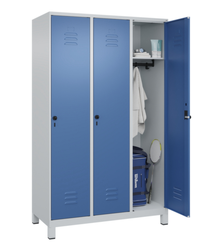 de belangrijkste maten van de C+P garderobekast Classic Plus in één oogopslag:per vak een vastgelaste hoedenplank en een kledingstang eronder met 3 niet verdraaibare, dubbele schuifhaken. openslaande deur met etikettenlijst en ventilatiesleuven. Door de binnenliggende penscharnieren zien de inliggende deuren er strak uit, want aan de buitenkant zijn geen schroeven of scharnieren zichtbaar. Dus de scharnieren doen geen afbreuk aan het design waardoor de hele kast er hoogwaardiger uitziet. Bovendien is het gladde oppervlak gemakkelijker te reinigen, zonder moeilijk bereikbare plaatsen waar vuil of stof zich kan ophopen. Elke deur is standaard uitgerust met een systeem voor gedempte sluiting , zodat de deur niet dichtslaat, zelfs niet wanneer deze een krachtige duw krijgt. Dit draagt niet alleen bij aan een rustigere werkomgeving, maar beschermt de stalen kast ook tegen beschadiging. Geïnspireerd door de natuur levert het BIONIC Steel Frame een bijzonder efficiënte en stabiele constructie op. De torsiestijfheid neemt verder toe door een ingenieuze structuur aan de binnenkant met plooien, steunen en tussenruimten, en door materiaalversterking op belangrijke punten, zoals aan de voorkant van de zijwanden en in de scheidingswand en kokerprofielen. Afsluitbaar met Veiligheidsdraaigrendel voor hangslot. Het veiligheidsslot is uitermate goed bestand tegen inbraak, omdat het doordraait wanneer het is vergrendeld en pas grijpt wanneer het slot is verwijderd. Passend voor alle hangsloten met een beugeldikte van 6 - 8 mm. De extra ventilatieopeningen in het vak, in combinatie met de ventilatiesleuven in de deur, verbeteren de luchtstroom. Dit zorgt voor een goede ventilatie in de kast waardoor de inhoud sneller droogt zonder onaangename geurtjes. Door de kunststof voeten onder de kast ziet de kast er niet alleen modern en minder massief uit, maar de voeten bieden ook praktische voordelen. De ruimte onder de kast is gemakkelijker schoon te maken en het kunststof van de voeten biedt een betere bescherming tegen corrosie. Vooral in omgevingen waar hogere eisen aan de hygiëne worden gesteld, is dit een belangrijk aspect. constructie van staal, stevig gelast. Dit maakt de constructie zeer robuust en sterk en dus duurzamer. Omdat de hoeken en randen van de romp gelast zijn, is de kast goed afgedicht en dus beter beschermd tegen stof, vocht en vuil dan bij een schroefconstructie. Bovendien is regelmatig onderhoud en nastellen niet nodig. romp met moffellak in RAL7035 lichtgrijs, front met moffellak in RAL5023 verblauw.