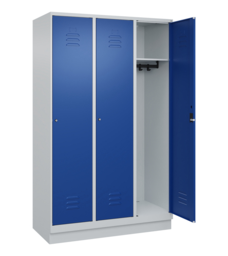 de belangrijkste maten van de C+P garderobekast Classic Plus in één oogopslag:per vak een vastgelaste hoedenplank en een kledingstang eronder met 3 niet verdraaibare, dubbele schuifhaken. openslaande deur met etikettenlijst en ventilatiesleuven. Door de binnenliggende penscharnieren zien de inliggende deuren er strak uit, want aan de buitenkant zijn geen schroeven of scharnieren zichtbaar. Dus de scharnieren doen geen afbreuk aan het design waardoor de hele kast er hoogwaardiger uitziet. Bovendien is het gladde oppervlak gemakkelijker te reinigen, zonder moeilijk bereikbare plaatsen waar vuil of stof zich kan ophopen. Elke deur is standaard uitgerust met een systeem voor gedempte sluiting , zodat de deur niet dichtslaat, zelfs niet wanneer deze een krachtige duw krijgt. Dit draagt niet alleen bij aan een rustigere werkomgeving, maar beschermt de stalen kast ook tegen beschadiging. Geïnspireerd door de natuur levert het BIONIC Steel Frame een bijzonder efficiënte en stabiele constructie op. De torsiestijfheid neemt verder toe door een ingenieuze structuur aan de binnenkant met plooien, steunen en tussenruimten, en door materiaalversterking op belangrijke punten, zoals aan de voorkant van de zijwanden en in de scheidingswand en kokerprofielen. afsluitbaar met cilinderslot. De extra ventilatieopeningen in het vak, in combinatie met de ventilatiesleuven in de deur, verbeteren de luchtstroom. Dit zorgt voor een goede ventilatie in de kast waardoor de inhoud sneller droogt zonder onaangename geurtjes. De sokkel onder de kast zorgt ervoor dat het gewicht van de kast gelijkmatig over de vloer wordt verdeeld. Hierdoor staat de kast stabieler en kan hij zwaardere lasten dragen dan een kast met voeten. En omdat er geen vuil, stof en vocht onder kan komen, hoeft er onder de kast niet te worden schoongemaakt. constructie van staal, stevig gelast. Dit maakt de constructie zeer robuust en sterk en dus duurzamer. Omdat de hoeken en randen van de romp gelast zijn, is de kast goed afgedicht en dus beter beschermd tegen stof, vocht en vuil dan bij een schroefconstructie. Bovendien is regelmatig onderhoud en nastellen niet nodig. romp met moffellak in RAL7035 lichtgrijs, front met moffellak in RAL5010 gentiaanblauw.