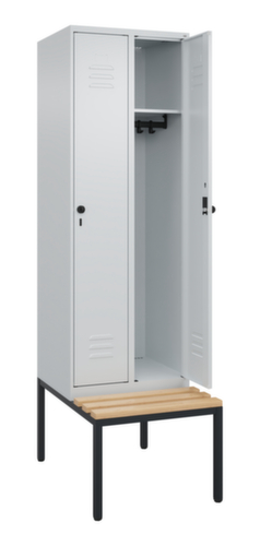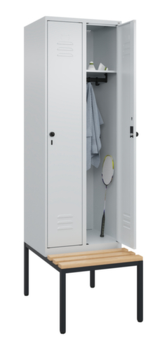 de belangrijkste maten van de C+P garderobekast Classic Plus in één oogopslag:per vak een vastgelaste hoedenplank en een kledingstang eronder met 3 niet verdraaibare, dubbele schuifhaken. openslaande deur met etikettenlijst en ventilatiesleuven. Door de binnenliggende penscharnieren zien de inliggende deuren er strak uit, want aan de buitenkant zijn geen schroeven of scharnieren zichtbaar. Dus de scharnieren doen geen afbreuk aan het design waardoor de hele kast er hoogwaardiger uitziet. Bovendien is het gladde oppervlak gemakkelijker te reinigen, zonder moeilijk bereikbare plaatsen waar vuil of stof zich kan ophopen. Elke deur is standaard uitgerust met een systeem voor gedempte sluiting , zodat de deur niet dichtslaat, zelfs niet wanneer deze een krachtige duw krijgt. Dit draagt niet alleen bij aan een rustigere werkomgeving, maar beschermt de stalen kast ook tegen beschadiging. Geïnspireerd door de natuur levert het BIONIC Steel Frame een bijzonder efficiënte en stabiele constructie op. De torsiestijfheid neemt verder toe door een ingenieuze structuur aan de binnenkant met plooien, steunen en tussenruimten, en door materiaalversterking op belangrijke punten, zoals aan de voorkant van de zijwanden en in de scheidingswand en kokerprofielen. Afsluitbaar met Veiligheidsdraaigrendel voor hangslot. Het veiligheidsslot is uitermate goed bestand tegen inbraak, omdat het doordraait wanneer het is vergrendeld en pas grijpt wanneer het slot is verwijderd. Passend voor alle hangsloten met een beugeldikte van 6 - 8 mm. De extra ventilatieopeningen in het vak, in combinatie met de ventilatiesleuven in de deur, verbeteren de luchtstroom. Dit zorgt voor een goede ventilatie in de kast waardoor de inhoud sneller droogt zonder onaangename geurtjes. De geïntegreerde bank zorgt voor een efficiënt gebruik van de beschikbare ruimte. Dit maakt aan- en uitkleden gemakkelijk en biedt opbergruimte onder de kast zonder extra ruimte in beslag te nemen. De randen zijn van beukenhout. constructie van staal, stevig gelast. Dit maakt de constructie zeer robuust en sterk en dus duurzamer. Omdat de hoeken en randen van de romp gelast zijn, is de kast goed afgedicht en dus beter beschermd tegen stof, vocht en vuil dan bij een schroefconstructie. Bovendien is regelmatig onderhoud en nastellen niet nodig. romp met moffellak in RAL7035 lichtgrijs, front met moffellak in RAL7035 lichtgrijs.