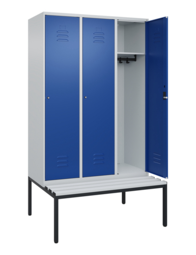 de belangrijkste maten van de C+P garderobekast Classic Plus in één oogopslag:per vak een vastgelaste hoedenplank en een kledingstang eronder met 3 niet verdraaibare, dubbele schuifhaken. openslaande deur met etikettenlijst en ventilatiesleuven. Door de binnenliggende penscharnieren zien de inliggende deuren er strak uit, want aan de buitenkant zijn geen schroeven of scharnieren zichtbaar. Dus de scharnieren doen geen afbreuk aan het design waardoor de hele kast er hoogwaardiger uitziet. Bovendien is het gladde oppervlak gemakkelijker te reinigen, zonder moeilijk bereikbare plaatsen waar vuil of stof zich kan ophopen. Elke deur is standaard uitgerust met een systeem voor gedempte sluiting , zodat de deur niet dichtslaat, zelfs niet wanneer deze een krachtige duw krijgt. Dit draagt niet alleen bij aan een rustigere werkomgeving, maar beschermt de stalen kast ook tegen beschadiging. Geïnspireerd door de natuur levert het BIONIC Steel Frame een bijzonder efficiënte en stabiele constructie op. De torsiestijfheid neemt verder toe door een ingenieuze structuur aan de binnenkant met plooien, steunen en tussenruimten, en door materiaalversterking op belangrijke punten, zoals aan de voorkant van de zijwanden en in de scheidingswand en kokerprofielen. afsluitbaar met cilinderslot. De extra ventilatieopeningen in het vak, in combinatie met de ventilatiesleuven in de deur, verbeteren de luchtstroom. Dit zorgt voor een goede ventilatie in de kast waardoor de inhoud sneller droogt zonder onaangename geurtjes. De geïntegreerde bank zorgt voor een efficiënt gebruik van de beschikbare ruimte. Dit maakt aan- en uitkleden gemakkelijk en biedt opbergruimte onder de kast zonder extra ruimte in beslag te nemen. De randen zijn van kunststof. constructie van staal, stevig gelast. Dit maakt de constructie zeer robuust en sterk en dus duurzamer. Omdat de hoeken en randen van de romp gelast zijn, is de kast goed afgedicht en dus beter beschermd tegen stof, vocht en vuil dan bij een schroefconstructie. Bovendien is regelmatig onderhoud en nastellen niet nodig. romp met moffellak in RAL7035 lichtgrijs, front met moffellak in RAL5010 gentiaanblauw.