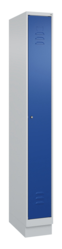 de belangrijkste maten van de C+P garderobekast Classic Plus in één oogopslag:per vak een vastgelaste hoedenplank en een kledingstang eronder met 3 niet verdraaibare, dubbele schuifhaken. openslaande deur met etikettenlijst en ventilatiesleuven. Door de binnenliggende penscharnieren zien de inliggende deuren er strak uit, want aan de buitenkant zijn geen schroeven of scharnieren zichtbaar. Dus de scharnieren doen geen afbreuk aan het design waardoor de hele kast er hoogwaardiger uitziet. Bovendien is het gladde oppervlak gemakkelijker te reinigen, zonder moeilijk bereikbare plaatsen waar vuil of stof zich kan ophopen. Elke deur is standaard uitgerust met een systeem voor gedempte sluiting , zodat de deur niet dichtslaat, zelfs niet wanneer deze een krachtige duw krijgt. Dit draagt niet alleen bij aan een rustigere werkomgeving, maar beschermt de stalen kast ook tegen beschadiging. Geïnspireerd door de natuur levert het BIONIC Steel Frame een bijzonder efficiënte en stabiele constructie op. De torsiestijfheid neemt verder toe door een ingenieuze structuur aan de binnenkant met plooien, steunen en tussenruimten, en door materiaalversterking op belangrijke punten, zoals aan de voorkant van de zijwanden en in de scheidingswand en kokerprofielen. afsluitbaar met cilinderslot. De extra ventilatieopeningen in het vak, in combinatie met de ventilatiesleuven in de deur, verbeteren de luchtstroom. Dit zorgt voor een goede ventilatie in de kast waardoor de inhoud sneller droogt zonder onaangename geurtjes. De sokkel onder de kast zorgt ervoor dat het gewicht van de kast gelijkmatig over de vloer wordt verdeeld. Hierdoor staat de kast stabieler en kan hij zwaardere lasten dragen dan een kast met voeten. En omdat er geen vuil, stof en vocht onder kan komen, hoeft er onder de kast niet te worden schoongemaakt. constructie van staal, stevig gelast. Dit maakt de constructie zeer robuust en sterk en dus duurzamer. Omdat de hoeken en randen van de romp gelast zijn, is de kast goed afgedicht en dus beter beschermd tegen stof, vocht en vuil dan bij een schroefconstructie. Bovendien is regelmatig onderhoud en nastellen niet nodig. romp met moffellak in RAL7035 lichtgrijs, front met moffellak in RAL5010 gentiaanblauw.