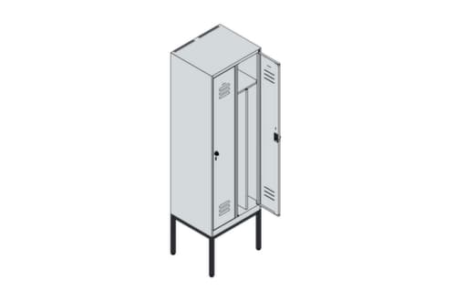 de belangrijkste maten van de C+P garderobekast Classic Plus in één oogopslag:per vak hoedenplank, kledingstang, haak. Het vak wordt onder de hoedenplank opgedeeld door een scheidingswand. Dit maakt een optimale scheiding tussen werk- en vrijetijdskleding mogelijk. openslaande deur met etikettenlijst en ventilatiesleuven. Door de binnenliggende penscharnieren zien de inliggende deuren er strak uit, want aan de buitenkant zijn geen schroeven of scharnieren zichtbaar. Dus de scharnieren doen geen afbreuk aan het design waardoor de hele kast er hoogwaardiger uitziet. Bovendien is het gladde oppervlak gemakkelijker te reinigen, zonder moeilijk bereikbare plaatsen waar vuil of stof zich kan ophopen. Elke deur is standaard uitgerust met een systeem voor gedempte sluiting , zodat de deur niet dichtslaat, zelfs niet wanneer deze een krachtige duw krijgt. Dit draagt niet alleen bij aan een rustigere werkomgeving, maar beschermt de stalen kast ook tegen beschadiging. Geïnspireerd door de natuur levert het BIONIC Steel Frame een bijzonder efficiënte en stabiele constructie op. De torsiestijfheid neemt verder toe door een ingenieuze structuur aan de binnenkant met plooien, steunen en tussenruimten, en door materiaalversterking op belangrijke punten, zoals aan de voorkant van de zijwanden en in de scheidingswand en kokerprofielen. Afsluitbaar met Veiligheidsdraaigrendel voor hangslot. Het veiligheidsslot is uitermate goed bestand tegen inbraak, omdat het doordraait wanneer het is vergrendeld en pas grijpt wanneer het slot is verwijderd. Passend voor alle hangsloten met een beugeldikte van 6 - 8 mm. De extra ventilatieopeningen in het vak, in combinatie met de ventilatiesleuven in de deur, verbeteren de luchtstroom. Dit zorgt voor een goede ventilatie in de kast waardoor de inhoud sneller droogt zonder onaangename geurtjes. Het ondergebouwde voetonderstel vermindert mogelijke ophoping van vuil en stof, omdat het gemakkelijker is om alle oppervlakken volledig te reinigen. Bovendien ontstaat hierdoor extra opbergruimte onder de kast. Schoenen en tassen staan niet meer in de weg, het risico op struikelen wordt kleiner. constructie van staal, stevig gelast. Dit maakt de constructie zeer robuust en sterk en dus duurzamer. Omdat de hoeken en randen van de romp gelast zijn, is de kast goed afgedicht en dus beter beschermd tegen stof, vocht en vuil dan bij een schroefconstructie. Bovendien is regelmatig onderhoud en nastellen niet nodig. romp met moffellak in RAL7035 lichtgrijs, front met moffellak in RAL 5012 lichtblauw.