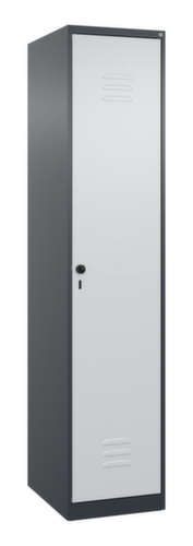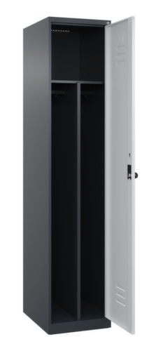 de belangrijkste maten van de C+P garderobekast Classic Plus in één oogopslag:per vak een vastgelaste hoedenplank en een kledingstang eronder met 3 niet verdraaibare, dubbele schuifhaken. Het vak wordt onder de hoedenplank opgedeeld door een scheidingswand. Dit maakt een optimale scheiding tussen werk- en vrijetijdskleding mogelijk. openslaande deur met etikettenlijst en ventilatiesleuven. Door de binnenliggende penscharnieren zien de inliggende deuren er strak uit, want aan de buitenkant zijn geen schroeven of scharnieren zichtbaar. Dus de scharnieren doen geen afbreuk aan het design waardoor de hele kast er hoogwaardiger uitziet. Bovendien is het gladde oppervlak gemakkelijker te reinigen, zonder moeilijk bereikbare plaatsen waar vuil of stof zich kan ophopen. Elke deur is standaard uitgerust met een systeem voor gedempte sluiting , zodat de deur niet dichtslaat, zelfs niet wanneer deze een krachtige duw krijgt. Dit draagt niet alleen bij aan een rustigere werkomgeving, maar beschermt de stalen kast ook tegen beschadiging. Geïnspireerd door de natuur levert het BIONIC Steel Frame een bijzonder efficiënte en stabiele constructie op. De torsiestijfheid neemt verder toe door een ingenieuze structuur aan de binnenkant met plooien, steunen en tussenruimten, en door materiaalversterking op belangrijke punten, zoals aan de voorkant van de zijwanden en in de scheidingswand en kokerprofielen. Afsluitbaar met Veiligheidsdraaigrendel voor hangslot. Het veiligheidsslot is uitermate goed bestand tegen inbraak, omdat het doordraait wanneer het is vergrendeld en pas grijpt wanneer het slot is verwijderd. Passend voor alle hangsloten met een beugeldikte van 6 - 8 mm. De extra ventilatieopeningen in het vak, in combinatie met de ventilatiesleuven in de deur, verbeteren de luchtstroom. Dit zorgt voor een goede ventilatie in de kast waardoor de inhoud sneller droogt zonder onaangename geurtjes. De kast staat direct op de vloer, zonder sokkel of poten, voor een compacte en ruimtebesparende look. Alleen stelschroeven zorgen voor een stabiele stand als de vloer eventueel ongelijk is. De bodem van de kast is tevens verzinkt voor een betere bescherming tegen corrosie. constructie van staal, stevig gelast. Dit maakt de constructie zeer robuust en sterk en dus duurzamer. Omdat de hoeken en randen van de romp gelast zijn, is de kast goed afgedicht en dus beter beschermd tegen stof, vocht en vuil dan bij een schroefconstructie. Bovendien is regelmatig onderhoud en nastellen niet nodig. romp met moffellak in RAL7016 antracietgrijs, front met moffellak in RAL7035 lichtgrijs.