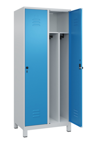 de belangrijkste maten van de C+P garderobekast Classic Plus in één oogopslag:per vak hoedenplank, kledingstang, haak. Het vak wordt onder de hoedenplank opgedeeld door een scheidingswand. Dit maakt een optimale scheiding tussen werk- en vrijetijdskleding mogelijk. openslaande deur met etikettenlijst en ventilatiesleuven. Door de binnenliggende penscharnieren zien de inliggende deuren er strak uit, want aan de buitenkant zijn geen schroeven of scharnieren zichtbaar. Dus de scharnieren doen geen afbreuk aan het design waardoor de hele kast er hoogwaardiger uitziet. Bovendien is het gladde oppervlak gemakkelijker te reinigen, zonder moeilijk bereikbare plaatsen waar vuil of stof zich kan ophopen. Elke deur is standaard uitgerust met een systeem voor gedempte sluiting , zodat de deur niet dichtslaat, zelfs niet wanneer deze een krachtige duw krijgt. Dit draagt niet alleen bij aan een rustigere werkomgeving, maar beschermt de stalen kast ook tegen beschadiging. Geïnspireerd door de natuur levert het BIONIC Steel Frame een bijzonder efficiënte en stabiele constructie op. De torsiestijfheid neemt verder toe door een ingenieuze structuur aan de binnenkant met plooien, steunen en tussenruimten, en door materiaalversterking op belangrijke punten, zoals aan de voorkant van de zijwanden en in de scheidingswand en kokerprofielen. Afsluitbaar met Veiligheidsdraaigrendel voor hangslot. Het veiligheidsslot is uitermate goed bestand tegen inbraak, omdat het doordraait wanneer het is vergrendeld en pas grijpt wanneer het slot is verwijderd. Passend voor alle hangsloten met een beugeldikte van 6 - 8 mm. De extra ventilatieopeningen in het vak, in combinatie met de ventilatiesleuven in de deur, verbeteren de luchtstroom. Dit zorgt voor een goede ventilatie in de kast waardoor de inhoud sneller droogt zonder onaangename geurtjes. Door de kunststof voeten onder de kast ziet de kast er niet alleen modern en minder massief uit, maar de voeten bieden ook praktische voordelen. De ruimte onder de kast is gemakkelijker schoon te maken en het kunststof van de voeten biedt een betere bescherming tegen corrosie. Vooral in omgevingen waar hogere eisen aan de hygiëne worden gesteld, is dit een belangrijk aspect. constructie van staal, stevig gelast. Dit maakt de constructie zeer robuust en sterk en dus duurzamer. Omdat de hoeken en randen van de romp gelast zijn, is de kast goed afgedicht en dus beter beschermd tegen stof, vocht en vuil dan bij een schroefconstructie. Bovendien is regelmatig onderhoud en nastellen niet nodig. romp met moffellak in RAL7035 lichtgrijs, front met moffellak in RAL 5012 lichtblauw.