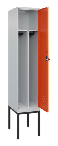 de belangrijkste maten van de C+P garderobekast Classic Plus in één oogopslag:per vak hoedenplank, kledingstang, haak. Het vak wordt onder de hoedenplank opgedeeld door een scheidingswand. Dit maakt een optimale scheiding tussen werk- en vrijetijdskleding mogelijk. openslaande deur met etikettenlijst en ventilatiesleuven. Door de binnenliggende penscharnieren zien de inliggende deuren er strak uit, want aan de buitenkant zijn geen schroeven of scharnieren zichtbaar. Dus de scharnieren doen geen afbreuk aan het design waardoor de hele kast er hoogwaardiger uitziet. Bovendien is het gladde oppervlak gemakkelijker te reinigen, zonder moeilijk bereikbare plaatsen waar vuil of stof zich kan ophopen. Elke deur is standaard uitgerust met een systeem voor gedempte sluiting , zodat de deur niet dichtslaat, zelfs niet wanneer deze een krachtige duw krijgt. Dit draagt niet alleen bij aan een rustigere werkomgeving, maar beschermt de stalen kast ook tegen beschadiging. Geïnspireerd door de natuur levert het BIONIC Steel Frame een bijzonder efficiënte en stabiele constructie op. De torsiestijfheid neemt verder toe door een ingenieuze structuur aan de binnenkant met plooien, steunen en tussenruimten, en door materiaalversterking op belangrijke punten, zoals aan de voorkant van de zijwanden en in de scheidingswand en kokerprofielen. Afsluitbaar met Veiligheidsdraaigrendel voor hangslot. Het veiligheidsslot is uitermate goed bestand tegen inbraak, omdat het doordraait wanneer het is vergrendeld en pas grijpt wanneer het slot is verwijderd. Passend voor alle hangsloten met een beugeldikte van 6 - 8 mm. De extra ventilatieopeningen in het vak, in combinatie met de ventilatiesleuven in de deur, verbeteren de luchtstroom. Dit zorgt voor een goede ventilatie in de kast waardoor de inhoud sneller droogt zonder onaangename geurtjes. Het ondergebouwde voetonderstel vermindert mogelijke ophoping van vuil en stof, omdat het gemakkelijker is om alle oppervlakken volledig te reinigen. Bovendien ontstaat hierdoor extra opbergruimte onder de kast. Schoenen en tassen staan niet meer in de weg, het risico op struikelen wordt kleiner. constructie van staal, stevig gelast. Dit maakt de constructie zeer robuust en sterk en dus duurzamer. Omdat de hoeken en randen van de romp gelast zijn, is de kast goed afgedicht en dus beter beschermd tegen stof, vocht en vuil dan bij een schroefconstructie. Bovendien is regelmatig onderhoud en nastellen niet nodig. romp met moffellak in RAL7035 lichtgrijs, front met moffellak in RAL2004 zuiver oranje.