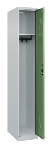 de belangrijkste maten van de C+P garderobekast Evolo PLUS in één oogopslag:per vak een vastgelaste hoedenplank en een kledingstang eronder met 3 niet verdraaibare, dubbele schuifhaken. De openslaande deuren kunnen met de handige etiketvensters heel eenvoudig worden gepersonaliseerd. Dankzij de design-perforatie, die voor een belangrijk deel aan de ventilatie bijdraagt, houdt de kast toch een strakke look en is deze hygiënisch en gemakkelijk te reinigen. Door de binnenliggende penscharnieren zien de inliggende deuren er strak uit, want aan de buitenkant zijn geen schroeven of scharnieren zichtbaar. Dus de scharnieren doen geen afbreuk aan het design waardoor de hele kast er hoogwaardiger uitziet. Bovendien is het gladde oppervlak gemakkelijker te reinigen, zonder moeilijk bereikbare plaatsen waar vuil of stof zich kan ophopen. Elke deur is standaard uitgerust met een systeem voor gedempte sluiting , zodat de deur niet dichtslaat, zelfs niet wanneer deze een krachtige duw krijgt. Dit draagt niet alleen bij aan een rustigere werkomgeving, maar beschermt de stalen kast ook tegen beschadiging. Geïnspireerd door de natuur levert het BIONIC Steel Frame een bijzonder efficiënte en stabiele constructie op. De torsiestijfheid neemt verder toe door een ingenieuze structuur aan de binnenkant met plooien, steunen en tussenruimten, en door materiaalversterking op belangrijke punten, zoals aan de voorkant van de zijwanden en in de scheidingswand en kokerprofielen. afsluitbaar met cilinderslot. Dankzij het uitgekiende concept van natuurlijke ventilatie is een constructief geoptimaliseerde luchtcirculatie mogelijk. Aangebrachte ventilerende vrije ruimtes voor en achter het legbord en ventilatieopeningen in bodem en dak dragen in combinatie met de perforatie in de deur bij aan een aangename luchtstroming. . Dit zorgt voor voldoende ventilatie in de kast waardoor de inhoud sneller droogt zonder onaangename geurtjes. De kast staat direct op de vloer, zonder sokkel of poten, voor een compacte en ruimtebesparende look. Alleen stelschroeven zorgen voor een stabiele stand als de vloer eventueel ongelijk is. De bodem van de kast is tevens verzinkt voor een betere bescherming tegen corrosie. constructie van staal, stevig gelast. Dit maakt de constructie zeer robuust en sterk en dus duurzamer. Omdat de hoeken en randen van de romp gelast zijn, is de kast goed afgedicht en dus beter beschermd tegen stof, vocht en vuil dan bij een schroefconstructie. Bovendien is regelmatig onderhoud en nastellen niet nodig. romp met moffellak in RAL7035 lichtgrijs, front met moffellak in RAL6011 resedagroen.